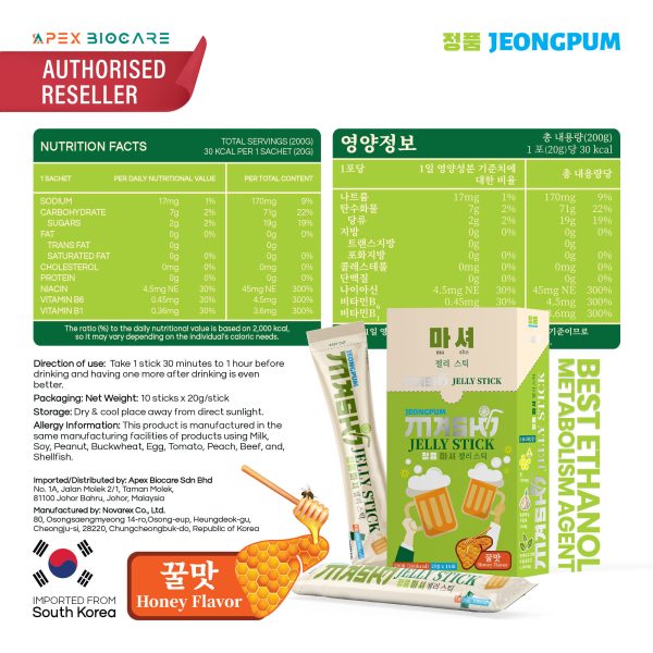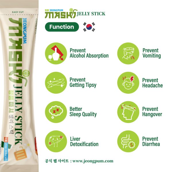MASHO by Jeongpum is a honey-flavored jelly stick that provides you with liver protection while you are drinking. In addition to improving your alcohol tolerance, MASHO can prevent horrible hangovers caused by alcohol, which can be a blessing for people who need to entertain frequently.