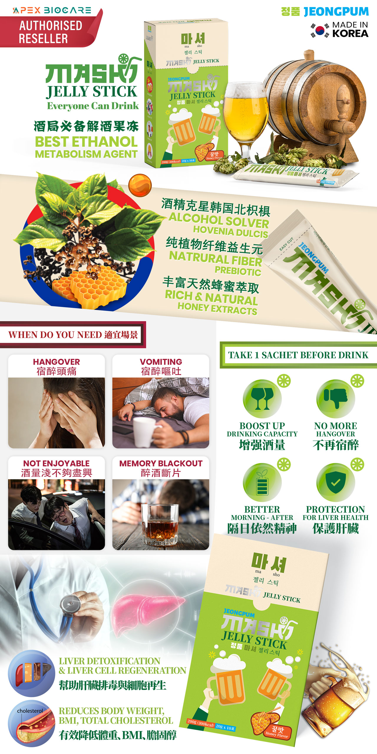 MASHO is a Korea-imported anti-alcohol jelly stick that efficiently helps in reducing the hangover and next-day fatigue caused by alcohol. Taking one stick of MASHO 30 minutes before drinking can effectively increase your alcohol tolerance so you can drink more even if you are lightweight. Besides, the special formulation of MASHO also promotes liver detoxification and prevents liver disease. MASHO shields your liver when you enjoy drinking, so you can drink with less concern.